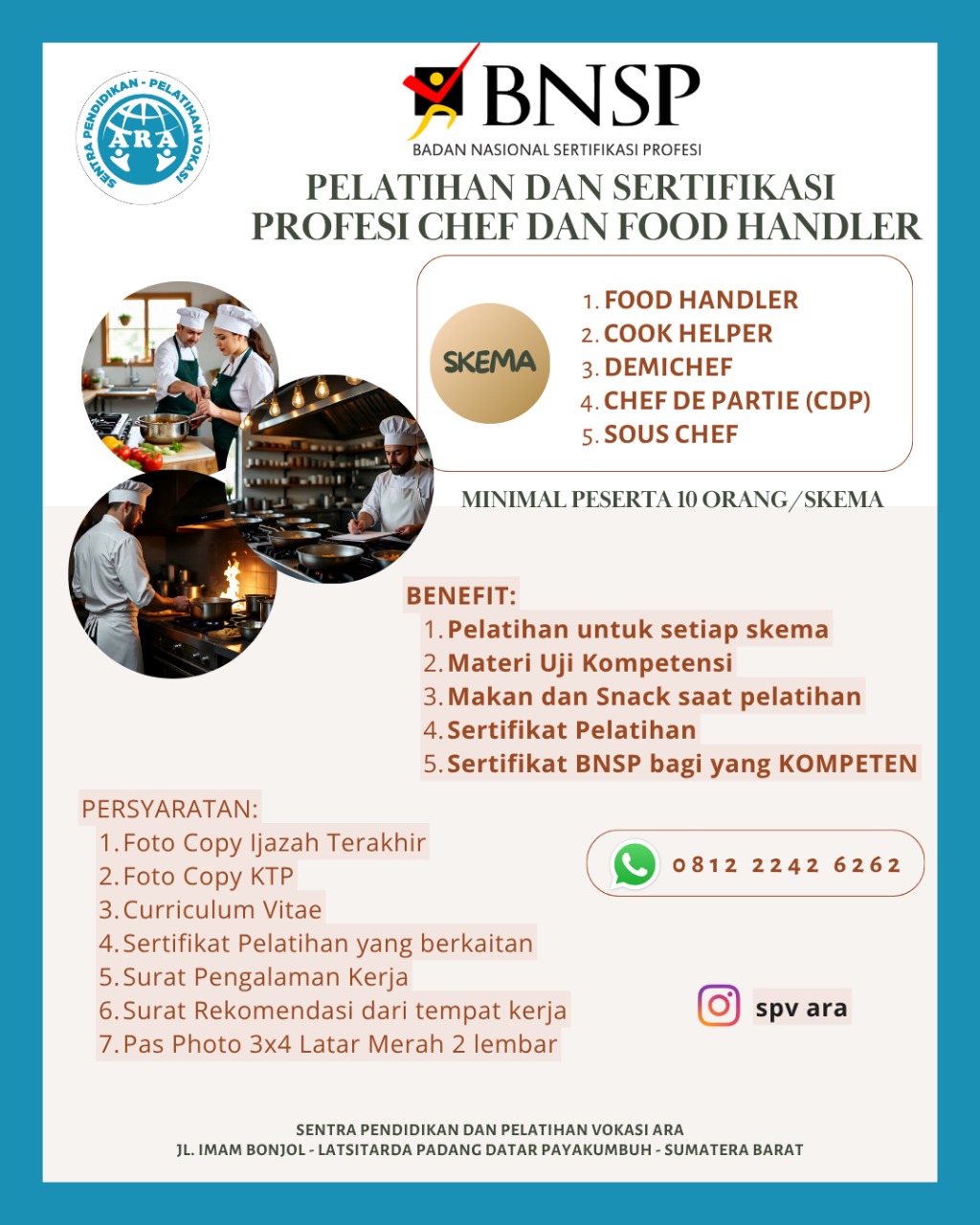 PELATIHAN DAN SERTIFIKASI PROFESI CHEF DAN FOOD HANDLER